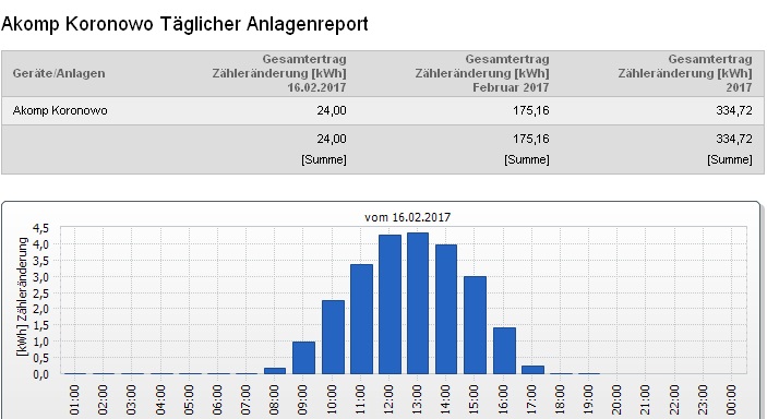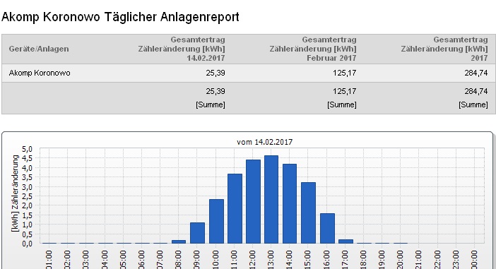 Chcielibyśmy"wyprostować" ten mit w niniejszej publikacji, a jako argumenty przedstawimy raporty z dziennej produkcji naszej demonstracyjnej instalacji testowej o mocy 10,2 kWp, zlokalizowanej na dachu salonu firmowego "Akomp" znajdującego się w Koronowie k. Bydgoszczy /opis tej instalacji znajdziecie TUTAJ/. Otóż ten właśnie system fotowoltaiczny już w połowie lutego potrafi wygenerować dzienną produkcję na poziomie 25 kWh, co przedstawiamy na poniższych raportach: