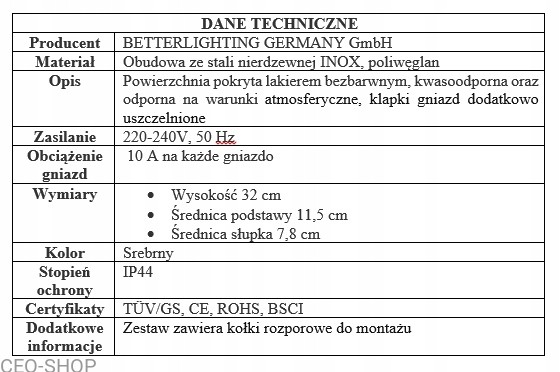 Sprawdzi się doskonale do podłączenia kosiarki, lampek dekoracyjnych, sprzętu grillowego czy elektronarzędzi. Prosty montaż i elegancki design sprawiają, że słupek pasuje do każdego ogrodu, podjazdu czy tarasu.