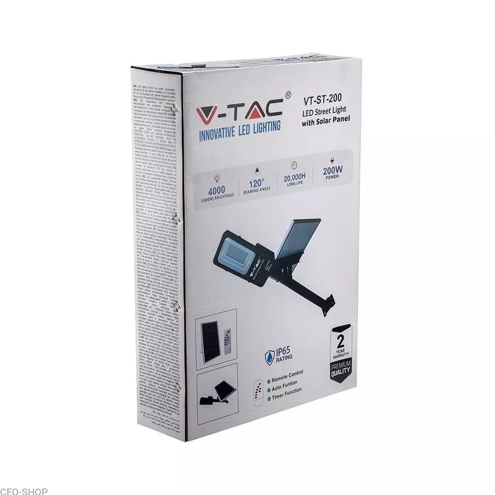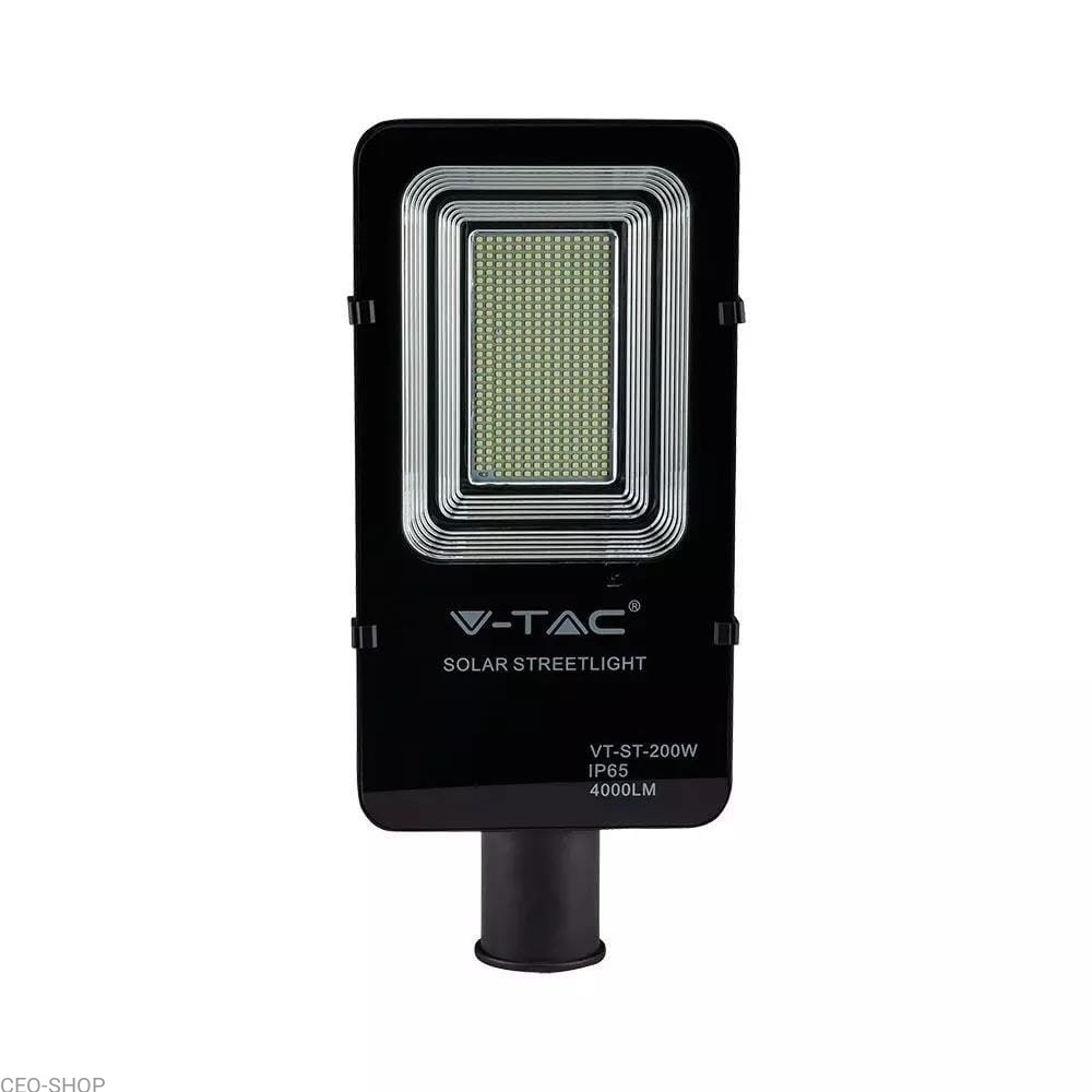 Solarna lampa uliczna, ogrodowa, parkowa od firmy V-TAC o zimnej barwie. Montaż możliwy na słupie i na elewacji budynku. Wyposażona w pilota zdalnego sterowania. Średnica wewnętrzna mocowania oprawy max. 65mm. Szczelność IP65. Akumulator Li-ion 6.4V/27.5AH. Czas pracy 8-12h Ładowanie 4-6h. Zakres temp. Pracy -20stC do +45°C